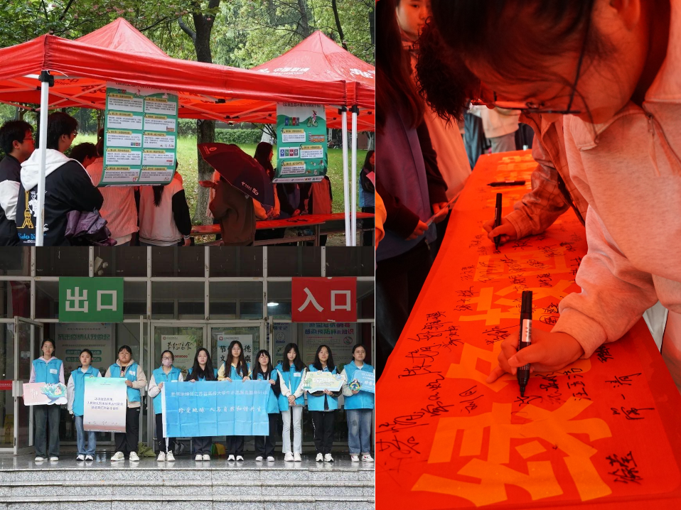 志愿服务小队下午于九龙湖校区橘园片区张贴世界地球日主题知识海报,积极宣传环保知识和节能减排方法,同时摆放“绿点筑梦”环保主题横幅,广泛动员校园师生共同呵护生态环境,以横幅签名方式表示对环保行动的支持和承诺。