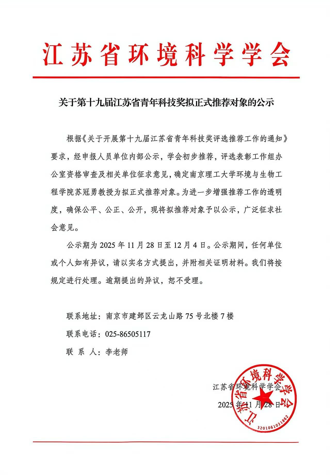 根据《关于开展第十九届江苏省青年科技奖评选推荐工作的通知》要求,经申报人员单位内部公示,学会初步推荐,评选表彰工作组办公室资格审查及相关单位征求意见,确定南京理工大学环境与生物工程学院苏冠勇教授为拟正式推荐对象。为进一步增强推荐工作的透明度,确保公平、公正、公开,现将拟推荐对象予以公示,广泛征求社会意见。