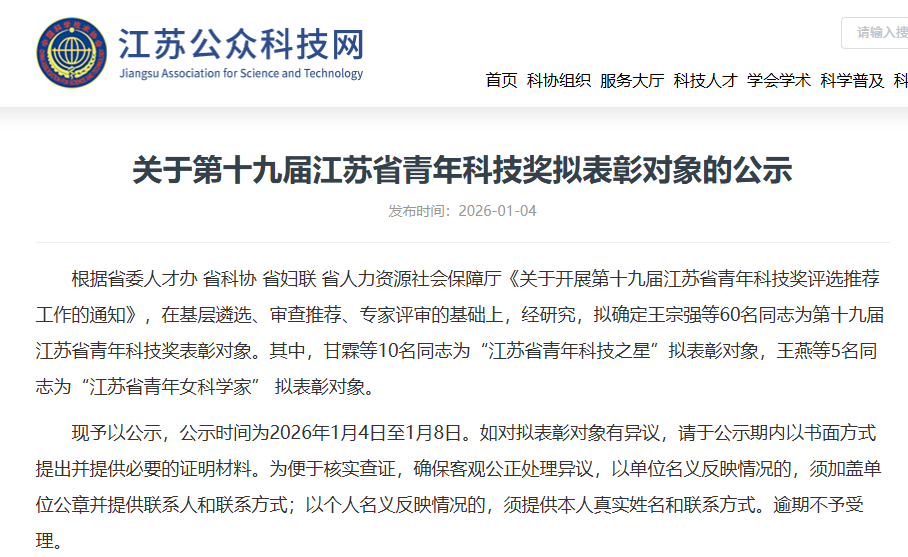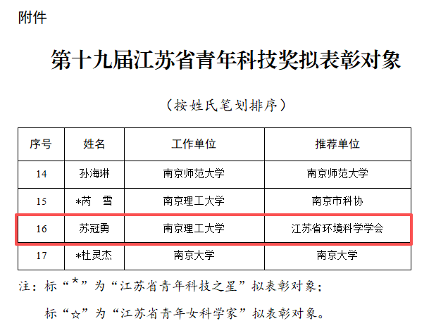 江苏省环境科学学会推荐一人成功入选 “第十九届江苏省青年科技奖”表彰对象
