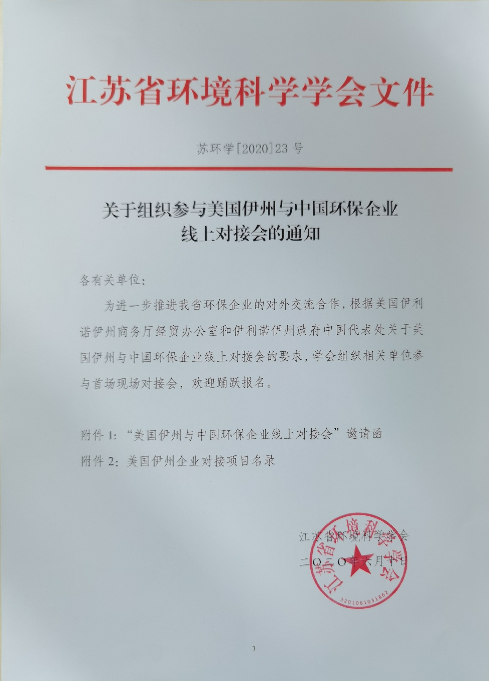 附件1: “美国伊州与中国环保企业线上对接会”邀请函