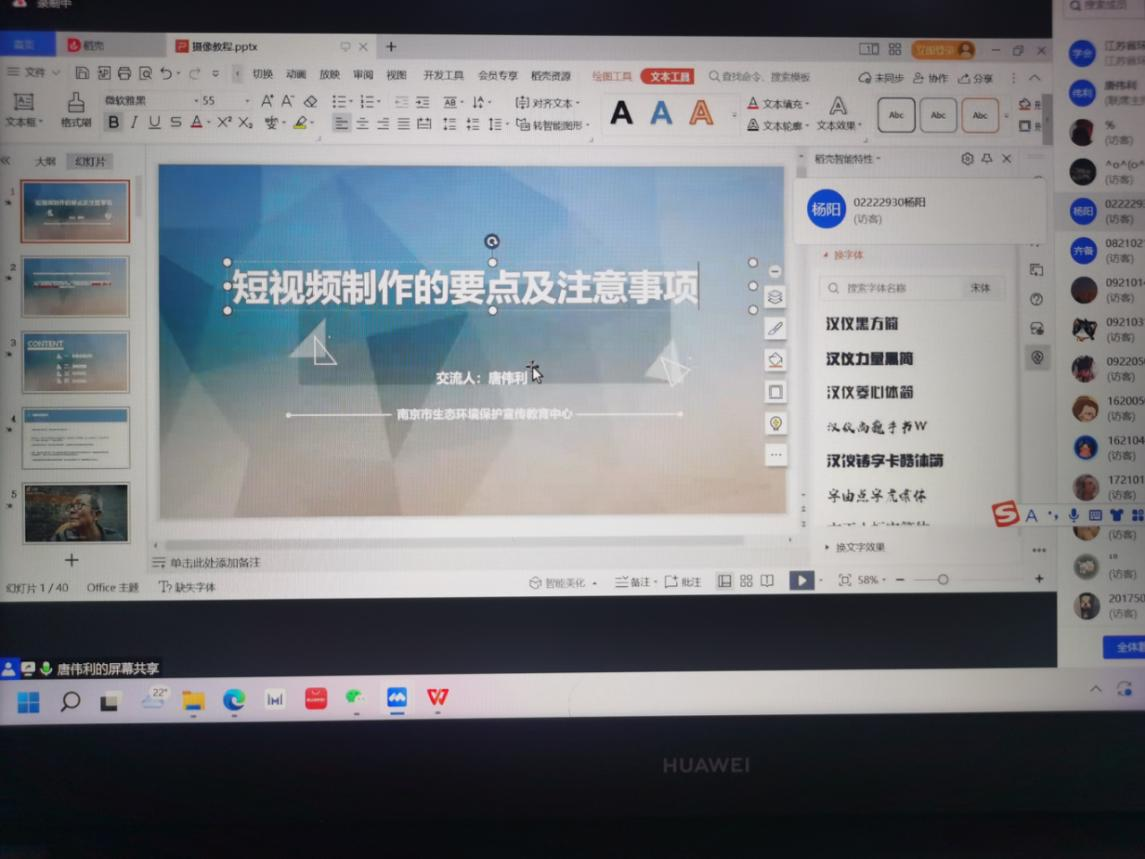 10月14日,学会组织了“美丽中国,我是行动者”视频制作讲解课,专门邀请南京市生态环境保护宣传教育中心新闻科副科长唐伟利讲解了短视频制作的要点及注意事项。355人观看了本次线上直播。
